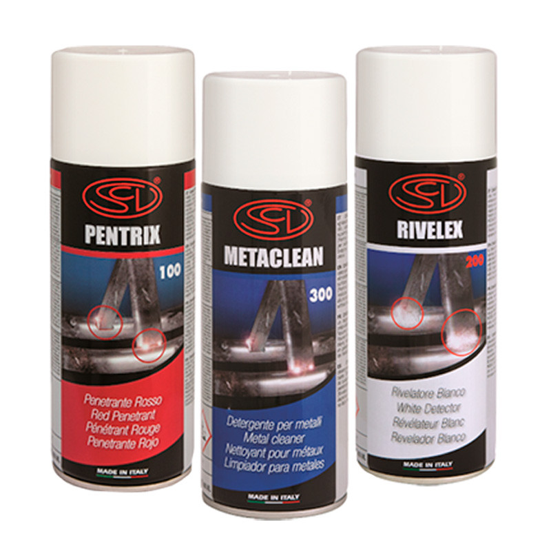 Італійська компанія Siliconi у сфері зварювальної хімії відома як виробник технічних спреїв, силіконових домішок та емульсій. Те, що вирізняє продукцію під брендом Siliconi, це якість, екологічність та відповідність сучасним вимогам. Для зварювального виробництва компанія пропонує різноманітні засоби, які супроводжують майже весь зварювальний процес: для різних поверхонь та деталей, що зварюються, в різних формах та станах (рідина, гель, спреї) тощо. Наприклад, Siliconi 1-2-3 – це не один засіб, а три, які складають повноцінний набір для виявлення тріщин під час проведення неруйнівного контролю якості зварних швів. Дослідження частин або ділянок деталей відбувається в три етапи, для кожного з яких використовується певний засіб з набору. Етапи неруйнівного контролю та застосовування засобів з набору: Очищення. Важливо, щоб ділянки деталей та зварні шви були чистими та сухими перед перевіркою. Такі забруднення, як окалина, іржа, мастила, залишки зварювального флюсу, бризки металу, фарба та інший бруд перешкоджають проведенню випробування. Тому на першому етапі потрібне очищення – для цього використовується очисник-спрей Siliconi з набору. Щоб осушити досліджувану поверхню можна застосувати нагрівання в печі, інфрачервоні лампи, або підсушити під сильним струменем повітря чи просто висушити природнім шляхом при кімнатній температурі. Важливо пам'ятати, щой перший етап неруйнівного контролю – очищення та сушка – мають бути ретельно та якісно проведені. Щоб рідина, яка потім наноситься на поверхню та проникає в дефекти, спрацювала належним чином, і результат випробування не був спотворений. Пенетрація. Другий етап дослідження поверхні – пенетрація. По завершенню очищення та сушки на ділянку рівномірно наноситься другий засіб з набору пенетрант-спрей Siliconi червоного кольору. Час проникнення від 10 до 20 хвилин при температурі навколишнього середовища 10 - 52 °C. Надлишок пенетранту за рекомендацією виробника можна усунути водою або розчинником. Для видалення надлишку слід використовувати чисту, тканинну ганчірку, змоченою водою або розчинником. Слід уникати надмірного використання рідини, це може призвести до повного видалення пенетранту з поверхні. Проявлення. Заключний етап неруйнівного контролю – використовується з набору проявник-спрей Siliconi білого кольору. Проявник слід наносити таким чином, щоб він повністю покрив досліджувану ділянку – утвориться тонка плівка. Оскільки засіб швидко випаровується при кімнатній температурі, тому додаткового сушіння не потребно. Час витримки проявника – мінімум 10 хвилин, але не більше 4 годин. За цей період дефекти стають видимими, включаючи найдрібніші.
